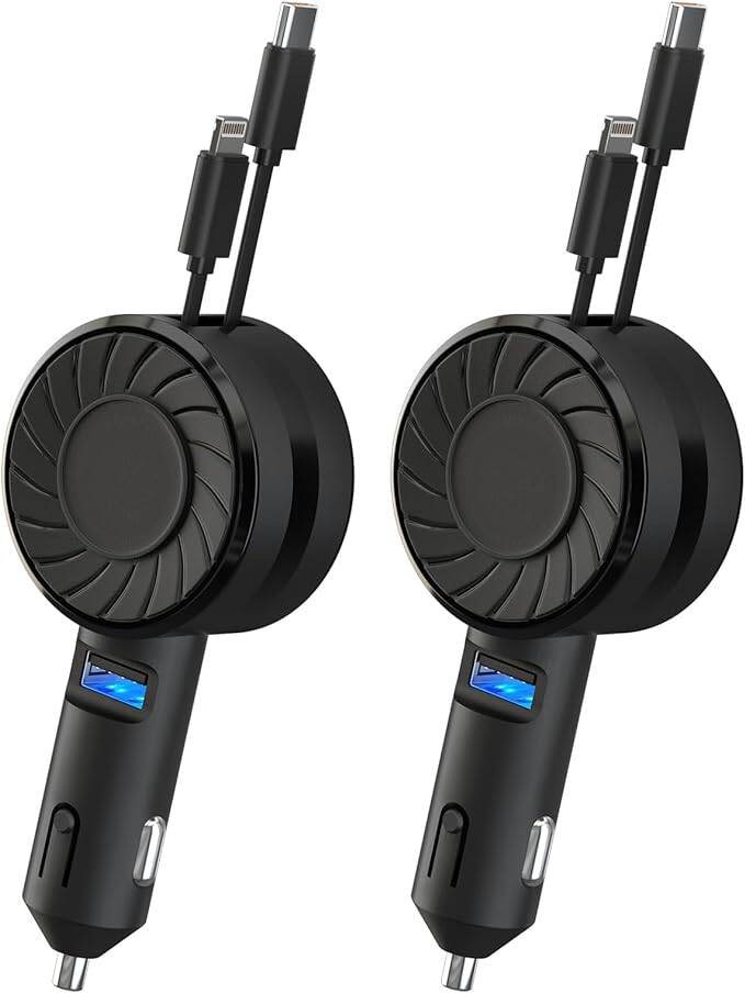 Retractable Car Charger (2Pack), 3 in 1 Fast Charging Car Phone Charger 50W, Mini Car Adapter with 2 Cables+1 Port Cigarette Lighter USB C Charger for Apple iPhone 15 Pro/Samsung/Android/Pixle, for just $17.99 with promo 50Y31RXS! Through 7/15/24. Click HERE