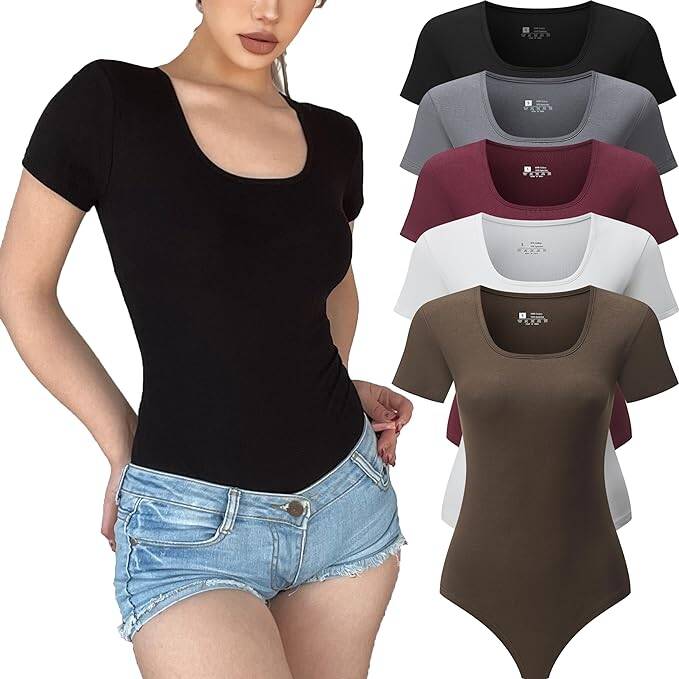 5 Pack Short Sleeve Bodysuits for Women Square Neck Casual Stretchy Basic Body Suits Tops T Shirts, for just $19.99 with promo 50KF5G1C! These comes in assorted sets!! Through 7/13/24.