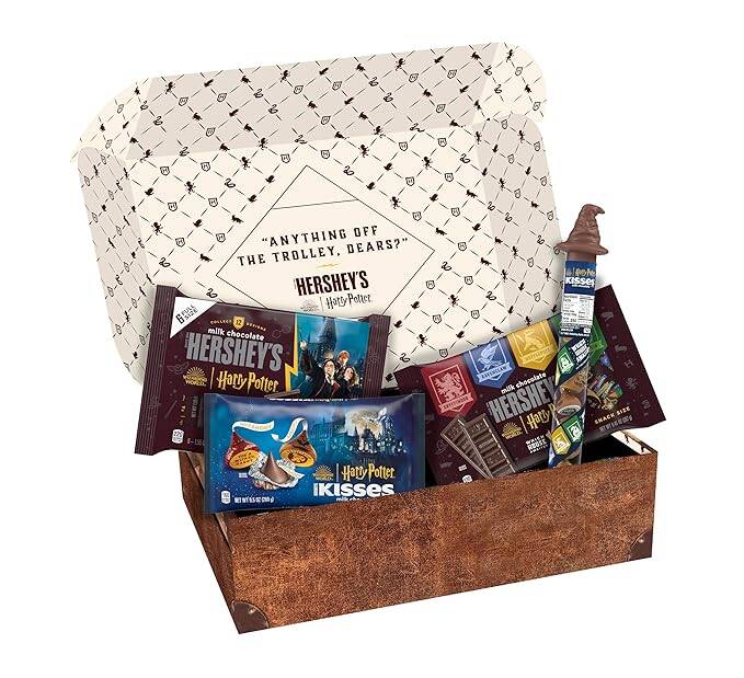 Contains (1) HERSHEY'S Milk Chocolate Snack Size Harry Potter Candy Bar, (1) HERSHEY'S KISSES Milk Chocolate Harry Potter Candy bag, (1) HERSHEY'S Milk Chocolate Harry Potter Candy Bars 6pack and (1) HERSHEY'S KISSES Milk Chocolate Harry Potter Candy Cane