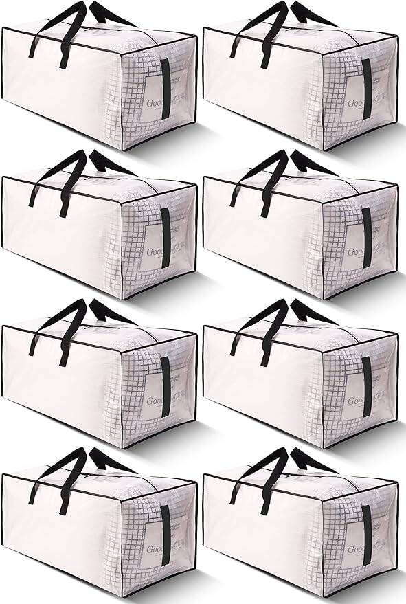 Price drop! 8 Pack Large Strong Moving Bags with Zippers & Carrying Handles - Water-Resistant - Heavy Duty Storage Tote for Space Saving, Fold Flat, Alternative to Moving Box (Semi-Transparent), for just $28.47! Go HERE