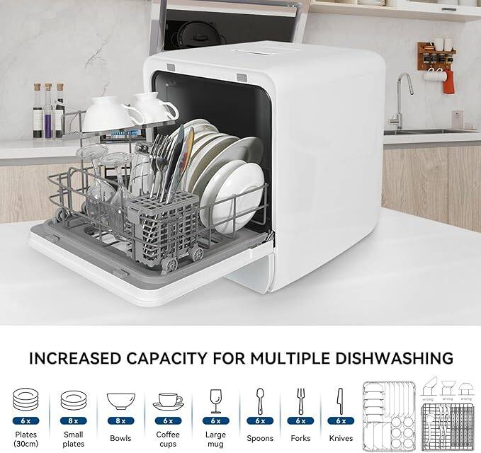 【6 Washing Modes】You'll get full size dishwasher cleaning in a countertop sized compact unit that offers five wash programs:Normal wash for 59 minutes, Rapid wash for 29 minutes, Strong wash for 79 minutes, Eco wash for 89 minutes, Fruit Wash for 19 minutes.6 washing modes could effectively respond to different washing needs for different soiled dishes.