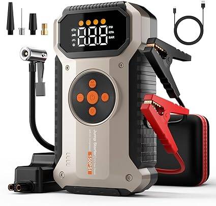 Jump Starter with Air Compressor, 4000A Portable Car Jumper Box Power Booster Pack,12V Battery Charger Car Jump Starter Combo 150 PSI Tire Inflator Air Pump for 8.5L Gas/7.0L Diesel, for just $48.87 with promo 94SX22Y9 + clip 38% off coupon! Go HERE