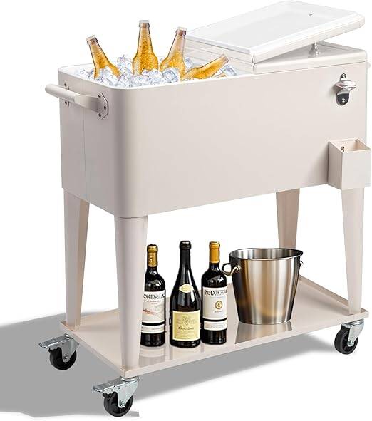 Outvita 80 Quart Rolling Ice Chest, Portable Bar Drink Cooler with Catch Basin, Bottom Storage Tray and Bottle Opener for Patio Party BBQ Beach Activities, for just $135.99! Go HERE