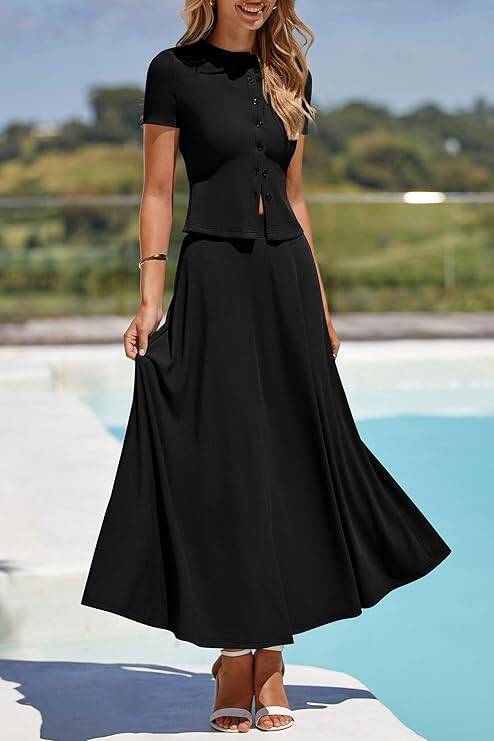 PRETTYGARDEN Women's 2 Piece Skirt Sets Summer Short Sleeve Button Up Knit Crop Top Flowy Maxi Skirts Travel Vacation Outfits, in assorted colors, for just $29.59, after you redeem 20% off coupon! Go HERE