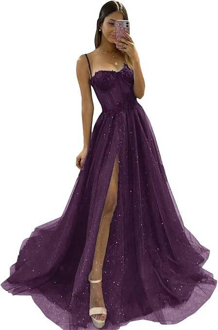 Sweet Sixteen or Prom , you can't go wrong with this dress! This comes in a bunch of colors! Wchecalino Glitter Tulle Prom Dresses Long 2025 Spaghetti Straps Sweetheart 3D Flowers Evening Party Gowns with Slit, for just $59.99 + $25.99 shipping fee! Go HERE