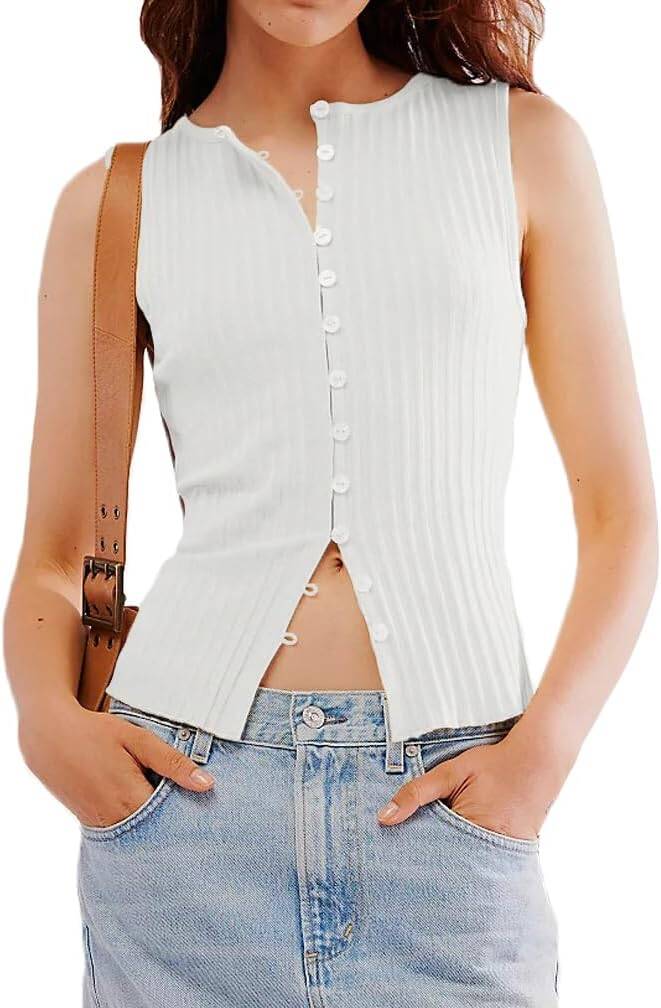 Women Button Down Ribbed Knit Tank Top Summer Slim Fit Sleeveless Round Neck Button Up Tank Vest Streetwear, for just $23.99! Go HERE