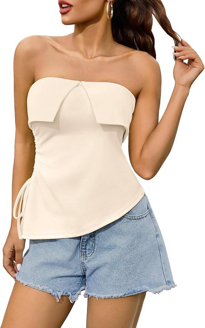 Update! LIGHTNING DEAL IS OVER GET IT NOW FOR JUST $14.99! Women Tube Tops Trendy Summer Going Out Strapless Backless Bustier Drawstring Ruched Side Split Asymmetrical Bandeau Shirt, on sale for just $13.49! Comes in four colors! Go HERE