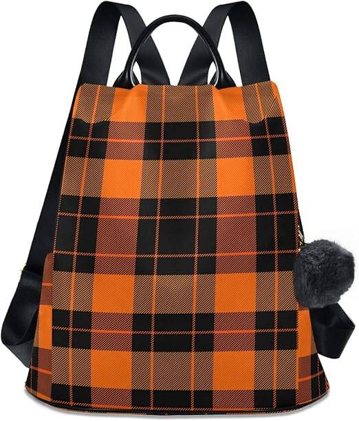 Looking for a stylish, secure, and seasonal bag? The ALAZA Halloween Pumpkin Orange Tartan Buffalo Plaid Backpack Purse is everything you need this fall.