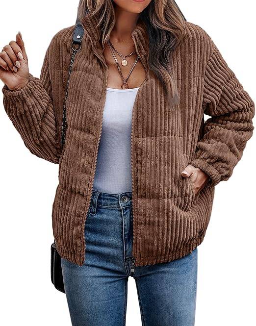 Angashion Women's Bomber Jacket Corduroy Ribbed Quilted Zip Up Long Sleeve Winter Coat Fall Outerwear Tops with Pockets, Brown, on sale $45.89, after coupons! Go HERE