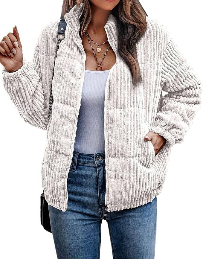 Angashion Women's Bomber Jacket Corduroy Ribbed Quilted Zip Up Long Sleeve Winter Coat Fall Outerwear Tops With Pockets Beige Medium, in assorted colors, on sale for just $33.95 after coupons clipped! Go HERE