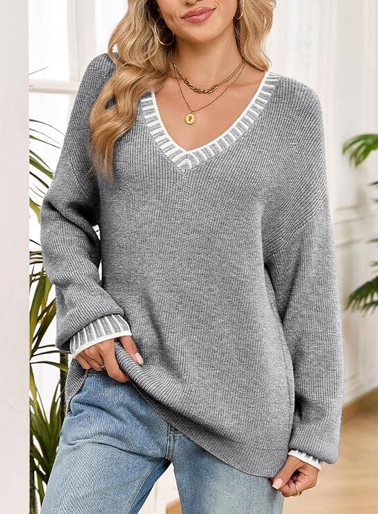 Dokotoo Womens Sweaters Casual V Neck Long Sleeve Contrast Knit Pullover Sweater Solid Fall Outfits Tops, assorted colors, on sale for just $26.99, after you clip $3.00 off coupon! Go HERE