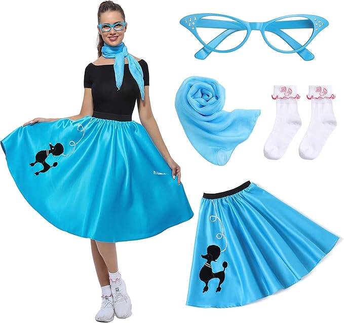 Women Sock Hop Costume, Adult 1950s Poodle Dress Costume, 50's Poodle Skirt with Glasses, Scarf and Socks, assorted colors, on sale for just $26.99! Go HERE