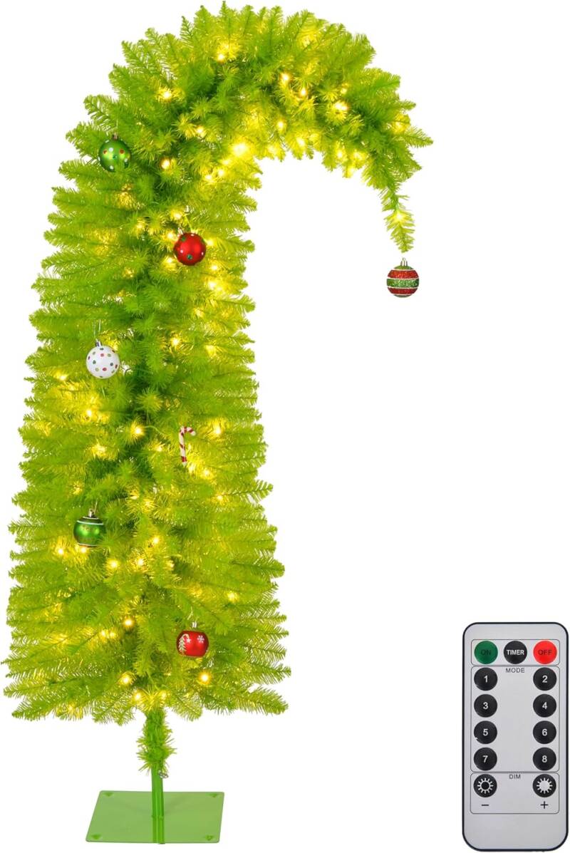 5.5 FT Lime Green Christmas Tree, Pre-Lit Curved Shape Artificial Xmas Tree with 150 LED Warm White Lights & Colorful Balls, 8 Lighting Modes Bendable Fake Pine Tree with Metal Base, on sale for just $52.49, after you clip $17.50 off coupon! Go HERE