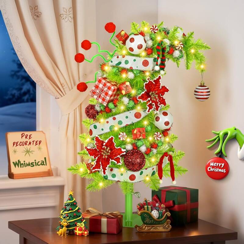 Krelymics 2FT Pre-Decorated Whimsical Small Christmas Tree with Lights, Artificial Bendable Mini Tabletop Christmas Tree with Metal Base & Ornaments for Home Holiday Decor(Lime Green), for just $29.99! Go HERE
