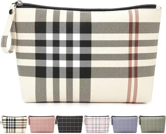 Prime Member Exclusive price! MAANGE Small Makeup Bag for Purse, 2 PCS Cosmetic Bag for Women Travel Makeup Pouch Leather Make up Bag Portable Zipper Pouch Brushes Bag - khaki plaid, on sale for just $9.49! Go HERE