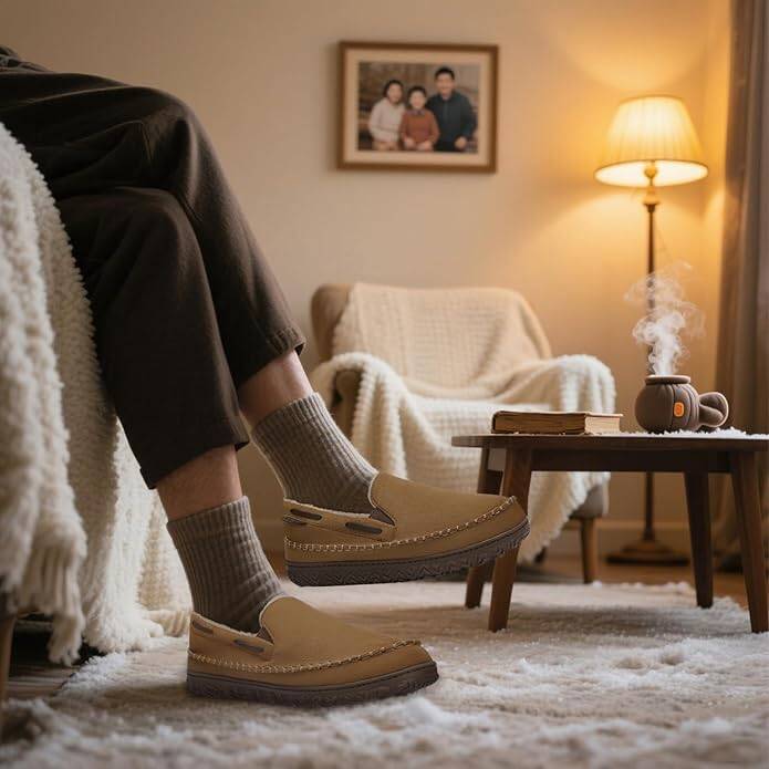 Rubber Sole: Sturdy sole of moccasin slippers is grippy, preventing falls on slippery tiles or hardwood floors without slipping or making noise