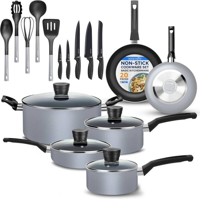 - 20-PIECE SET: The SereneLife Cookware Set features 20pc nonstick set which includes 0.89 & 1.90qt sauce pots w/ lids, 4.70qt dutch oven pot w/ lid, 2.5qt saute pan w/ lid, 8” & 10” fry pans, spoon, spatula, pasta server, ladle, whisk, and a knife set