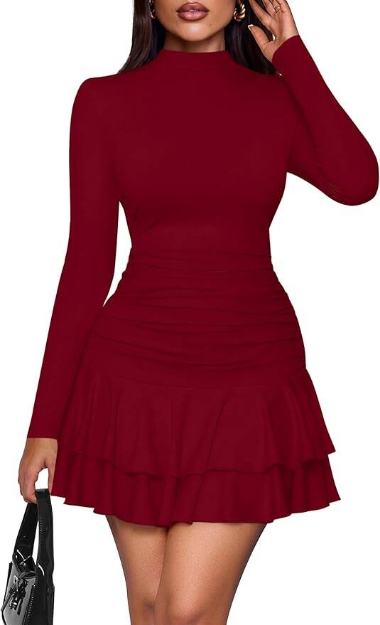 PRETTYGARDEN Womens Spring Long Sleeve Dresses 2026 Mock Neck Ruched Y2K Clothes Ruffle Layered Bodycon Mini Party Dress, assorted colors, prices vary by color, on sale for just $35.99! Go HERE