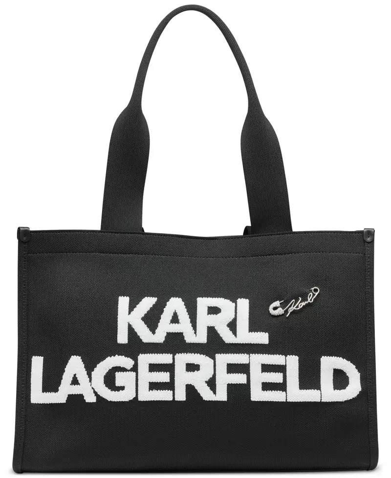 Designed with a magnetic snap closure and an adjustable crossbody strap, this KARL LAGERFELD PARIS tote bag offers versatile carrying options. The top handle adds another way to wear this modern knit tote.