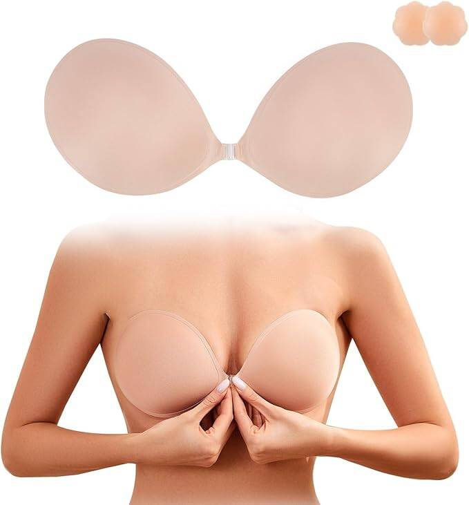 The Sticky Bra Push-Up Adhesive Bra features soft cloth padding with added cup lift for a flattering, natural shape. It’s strapless, backless, reusable, and completely invisible under dresses and tops. Perfect for special occasion outfits or everyday wear when you want support without straps.