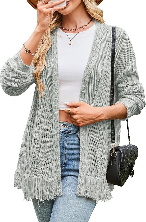 The Cakulo Women’s Crochet Fringe Cardigan is the perfect lightweight layer for fall and beyond. Featuring an oversized fit, open-front design, cable knit texture, and fringe details. Available in assorted colors to match any outfit.