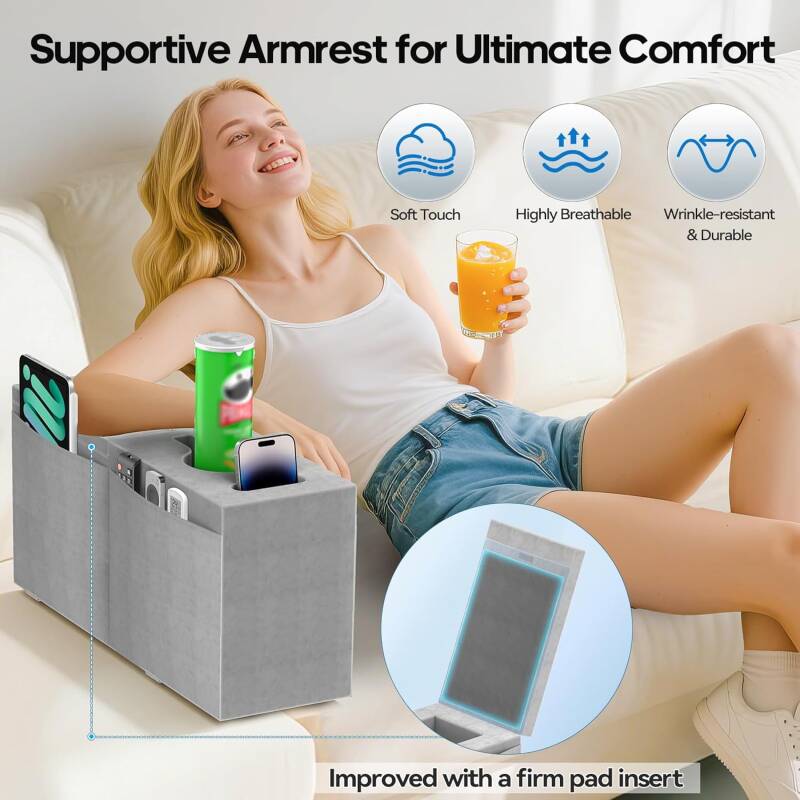 Upgrade your lounging setup with this Sofa Armrest Pillow featuring a built-in cup holder and removable cushion tray. Designed for comfort and convenience, it keeps everything you need within reach while you relax.