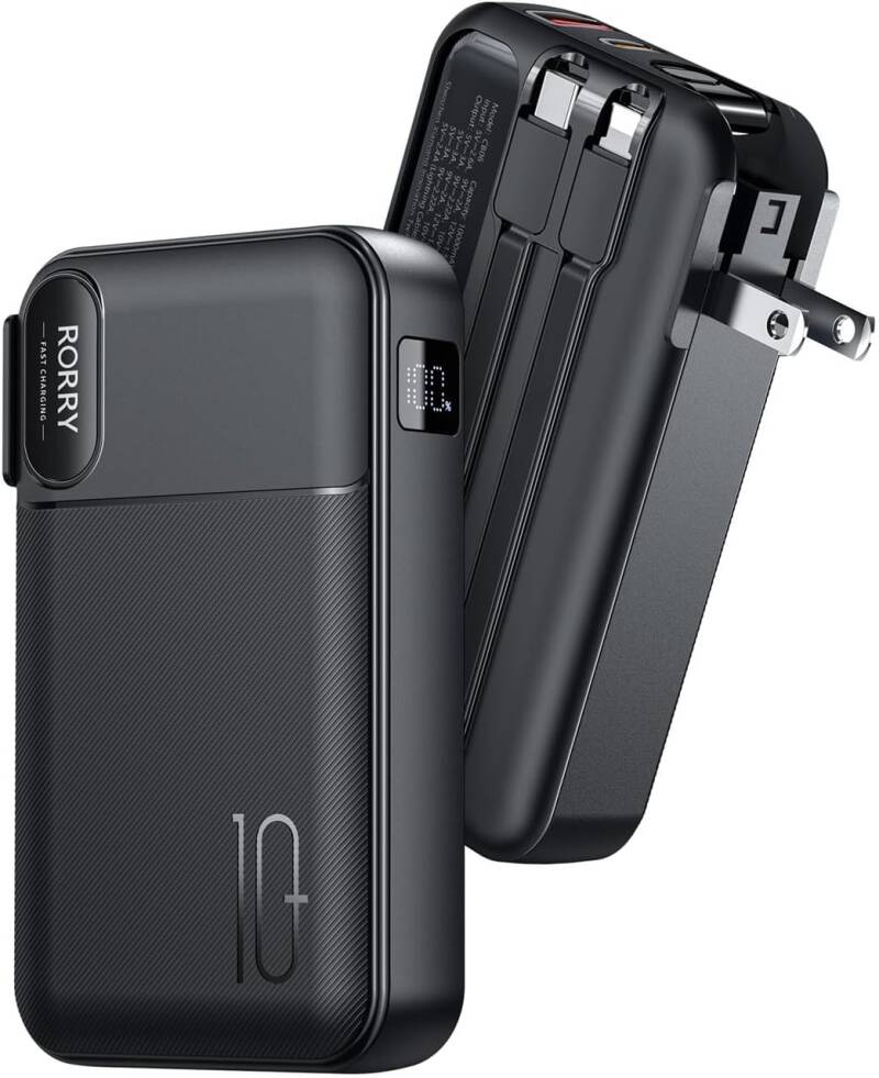 Stay powered on the go with the RORRY Portable Charger. This 10,000mAh travel battery pack features built-in cables and an AC wall plug for ultimate convenience. With 22.5W fast charging, it’s compatible with iPhone 17/16/15, Samsung Galaxy S24/S23/S22, Pixel, LG, iPad, and more.