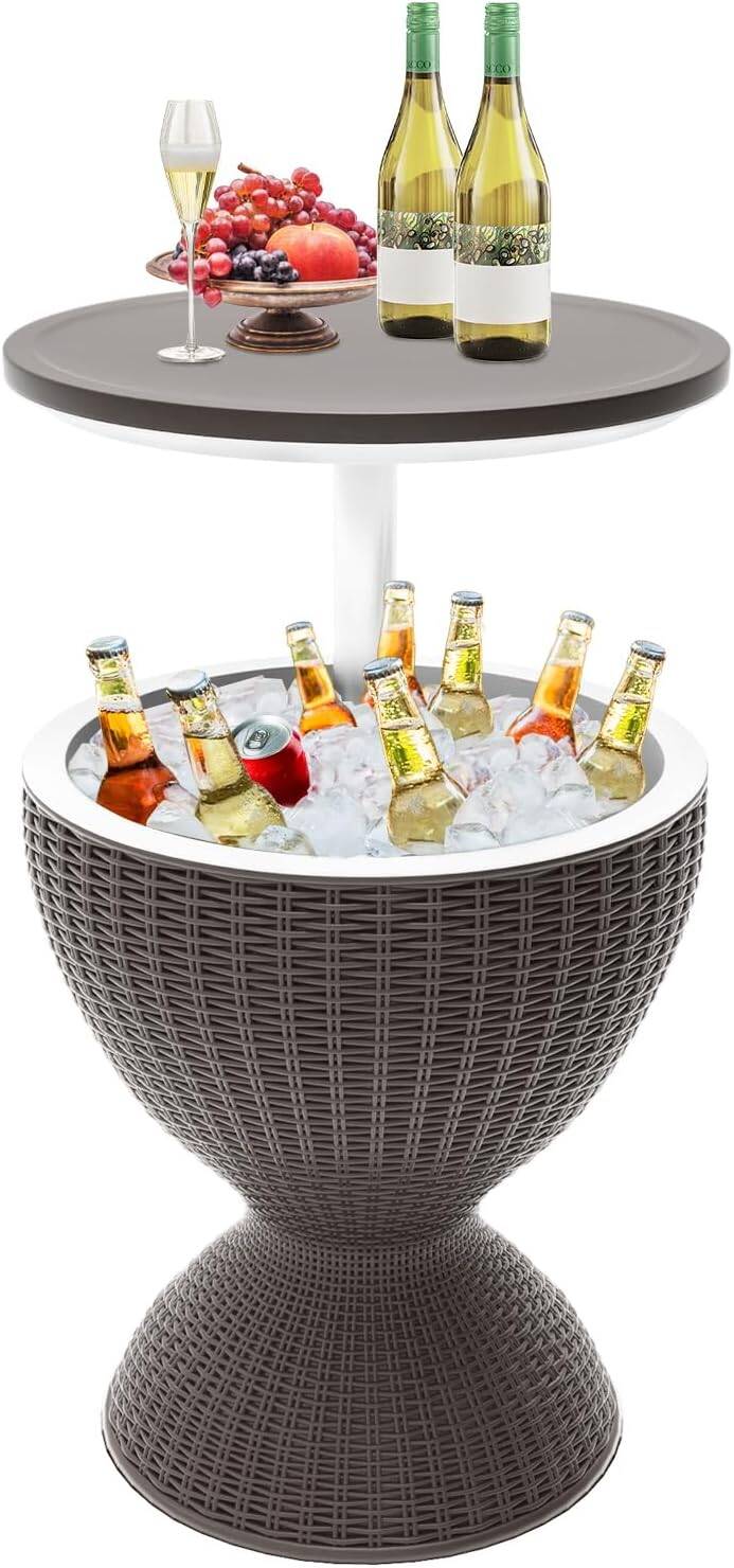The SHAREWIN Patio Cool Bar Table is a 3-in-1 outdoor bar table and cooler designed to keep drinks chilled while doubling as a stylish patio table. Featuring an 8-gallon capacity, height-adjustable design, and built-in drainage plug, it’s perfect for pool parties, BBQs, and backyard get-togethers.