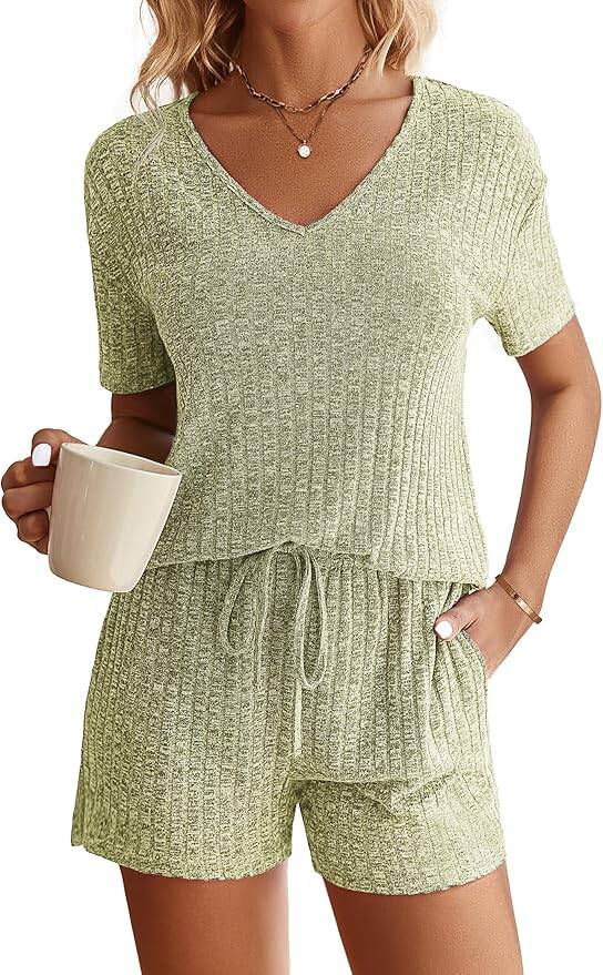 Cozy up in style with the Ekouaer Women’s Ribbed Knit Lounge Set, featuring a short sleeve top and matching shorts for the perfect comfy two-piece outfit. This soft, stretchy pajama set comes in assorted colors and is great for lounging, sleeping, or relaxed weekend wear.