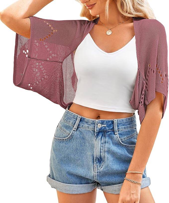 Add a lightweight layer to your outfit with the BB&KK Women’s Summer Crochet Cardigan. This stylish hollow-out shrug features a batwing short sleeve design and open front, making it perfect for pairing with dresses, tanks, or summer outfits.