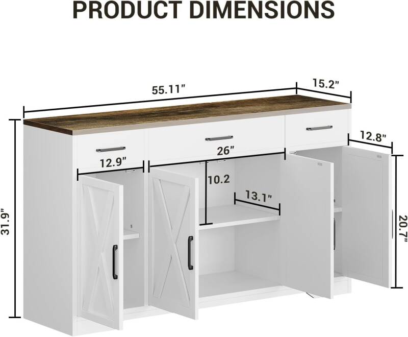 • 55" farmhouse buffet sideboard with drawers, shelves, and doors
