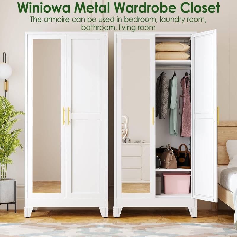 This Metal Armoire Wardrobe Closet features 2 mirrored doors, adjustable shelves, and a hanging rod, perfect for storing clothes, shoes, and accessories.