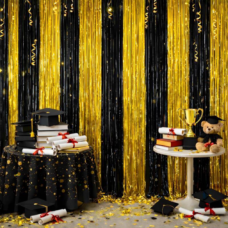 The Graduation Decorations 2026 – Black & Gold Graduation Cap Tinsel Streamers Backdrop Banner (2-Pack) is on sale for just $3.50 (50% off!) and comes in two colors.