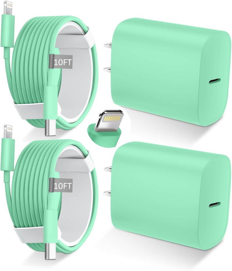 This 10FT Fast Charger Kit includes a Lightning cable and 20W USB-C charger block, compatible with iPhone 14/13/12/11 series, iPad, and more.