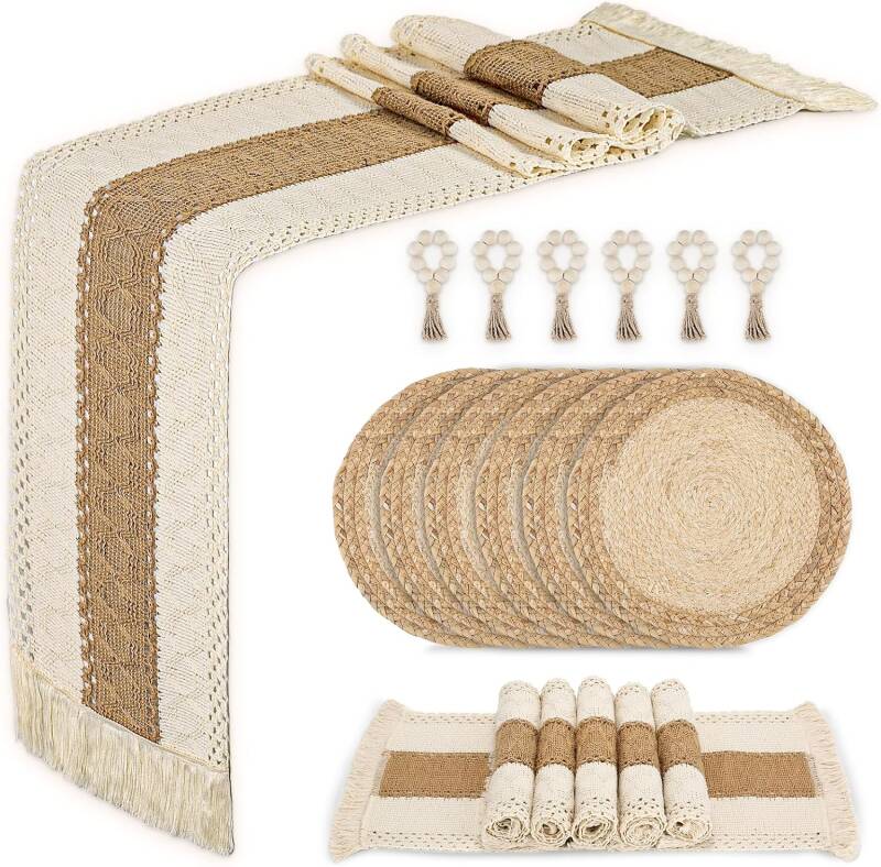 This Placemats Set of 6 includes charger-style mats, a table runner, and napkin rings, all made from natural cotton burlap and corn husk for a beautiful boho-inspired look.