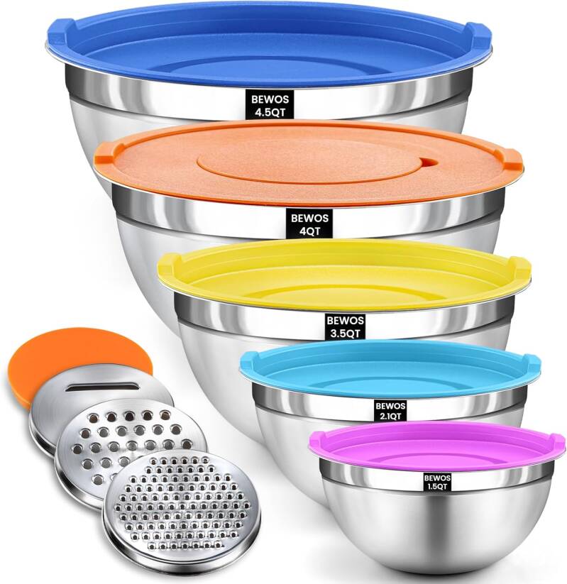 Prime members can score the BEWOS 5-piece stainless steel mixing bowl set with lids. This set includes bowls in sizes 4.5, 4, 3.5, 2.1, and 1.5 quarts, plus 3 grater attachments. Great for baking, prepping, and serving, with durable stainless steel and convenient lids.