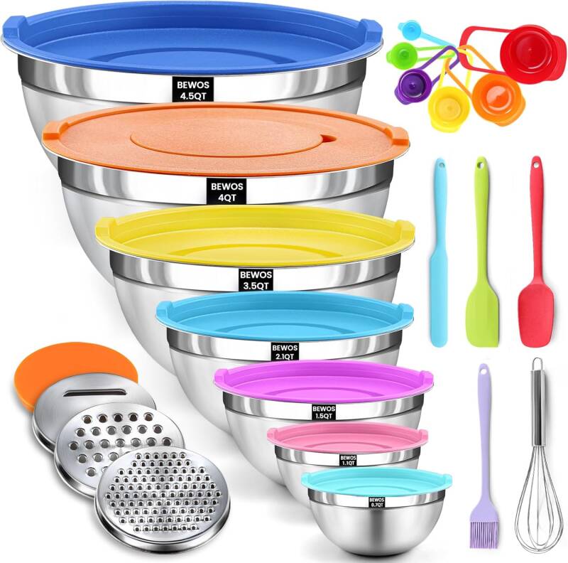 On the same page, there’s another option to choose from. The BEWOS 21-piece mixing bowl set includes 7 stainless steel bowls, 3 graters, and 11 practical kitchen accessories. It’s dishwasher safe, easy to store, and perfect for baking, meal prep, and everyday use.