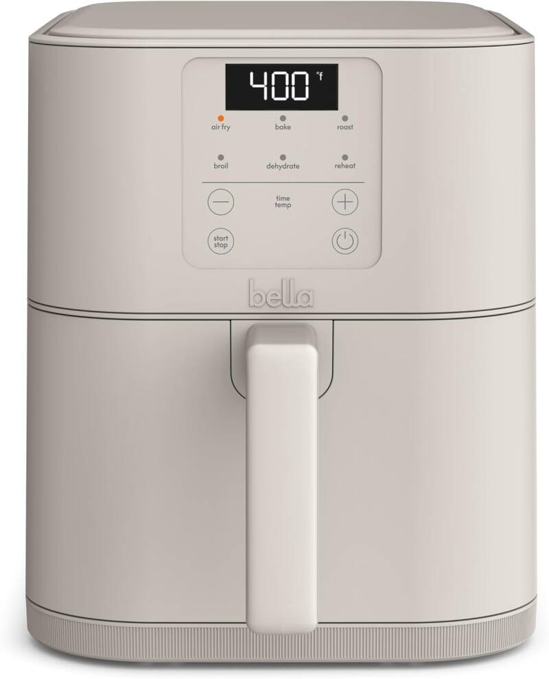 The bella 6 qt slim air fryer is designed to fit anywhere while still offering plenty of cooking space with its 5 lb capacity. It features EverGood ceramic nonstick coating for easy cleanup, adjustable temperature control, and 6 preset cooking options to make meals quick and simple. The 60-minute auto shutoff with an audible tone adds extra convenience and safety. Available in oatmilk or pink at this price.