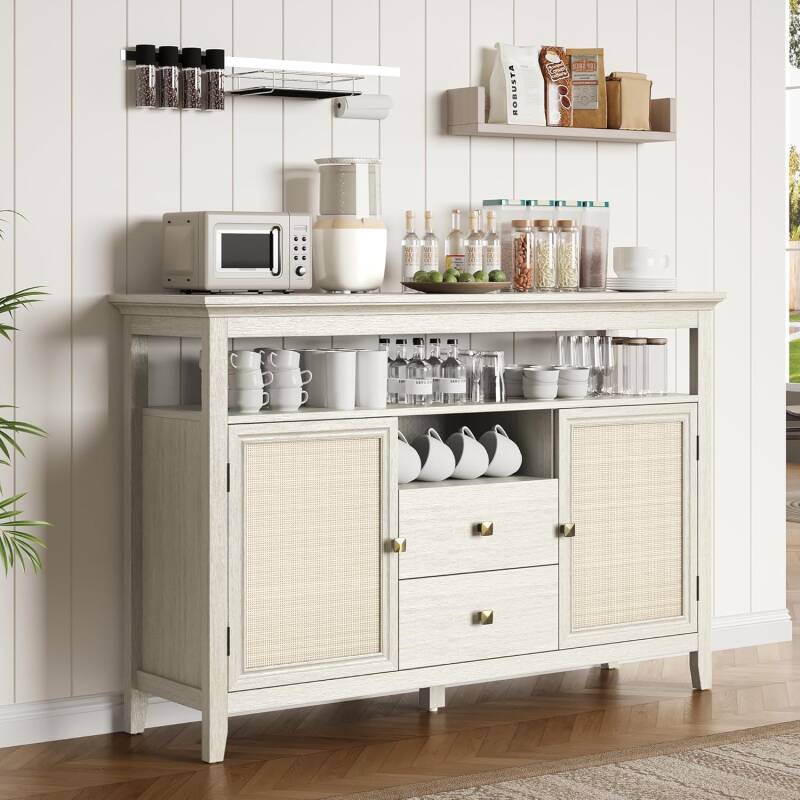 This 53" farmhouse-inspired sideboard features beautiful rattan detailing, 2 doors, and 2 drawers—perfect for storing coffee essentials, dining items, or entryway décor.