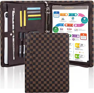Designer Inspired Look! PU Leather Portfolio Binder, 3 Ring Zippered Padfolio Design with Pad 13" Holder and Notepad Holder, Handmade Gifts for Women – Brown Grid, for just $39.80! Go HERE