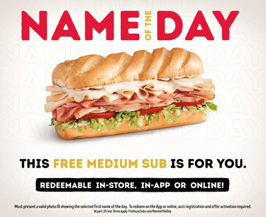 For a limited time, Firehouse Subs is offering its popular Name of the Day promotion. Get a free medium sub with any purchase if your name is selected! New names are selected each day, so be sure to bookmark this post and come back daily to see if you’re getting a free sub! Click HERE