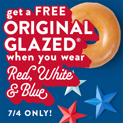 On July 4th Krispy Kreme is offering a FREE Original Glazed Doughnut when you visit their shop wearing red, white, and blue! Valid at all participating shops in shop and drive thru, limit 1 per person. Click HERE