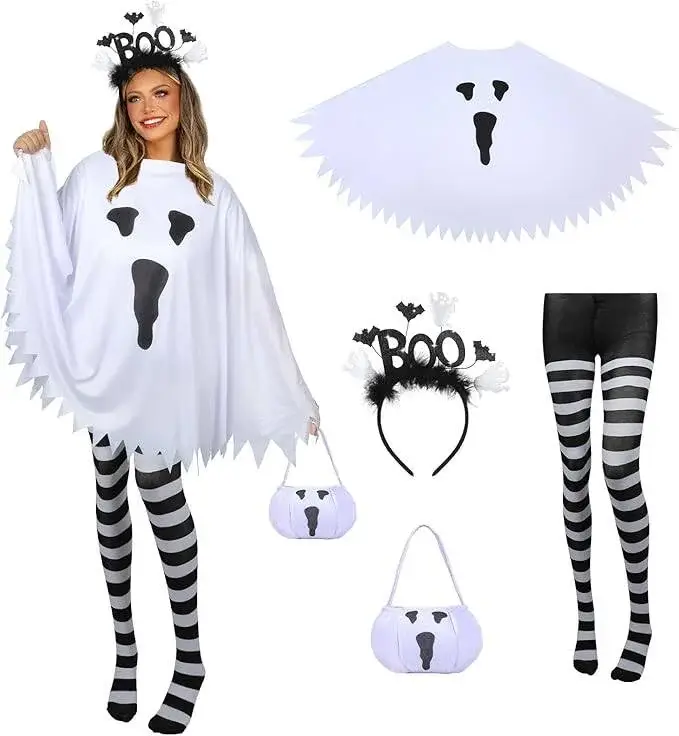 4 PCS Halloween Costume Set for Women Adult Ghost Costume, Ghost Costume Poncho, Candy bag, Ghost Headband and Nylon Striped Tights for Halloween Cosplay Party, for just $23.99! Go HERE