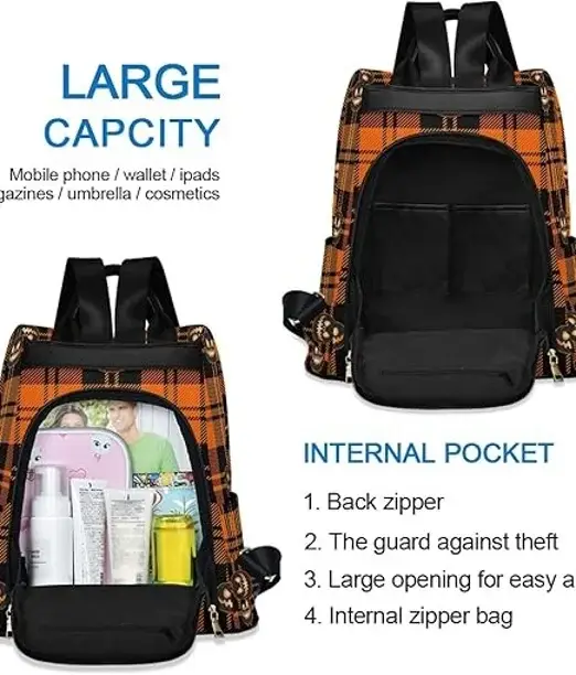 Looking for a stylish, secure, and seasonal bag? The ALAZA Halloween Pumpkin Orange Tartan Buffalo Plaid Backpack Purse is everything you need this fall.