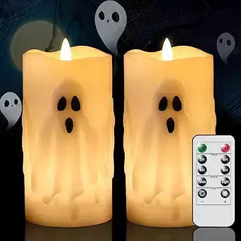 Halloween Ghost Flameless Pillar Candles with Remote Timer, Battery Operated LED Candles for Halloween Decorations Indoor Halloween Home Decor Gifts (2 Pack, 3” x 6.5”), on sale for just $21.59! Go HERE